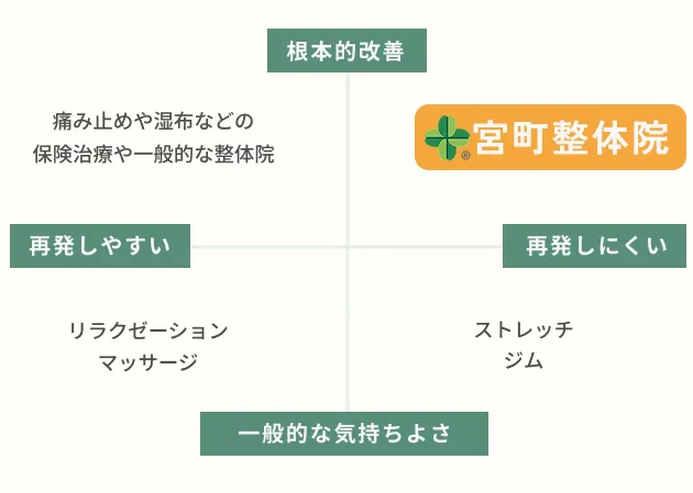 当院では、痛みを一時的に和らげるだけでなく、体が本来持っている自己治癒力を取り戻すことを目的としています。